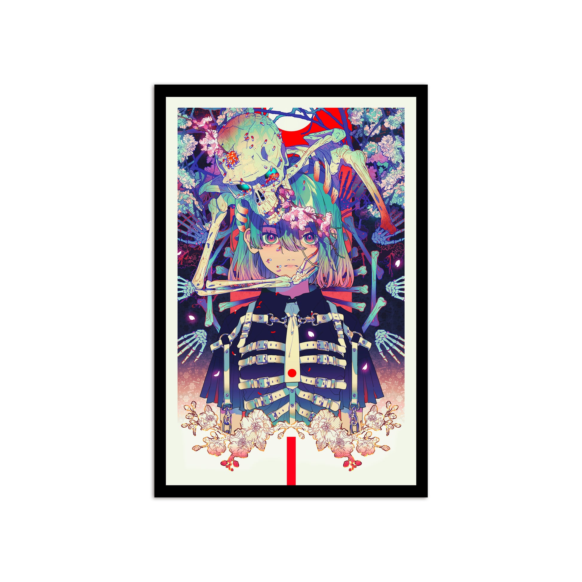 ジェリービーンズのようにデザインされた蛆が湧いています。骸骨が桜の下から這い出てきてるような姿をイメージして描かれています。