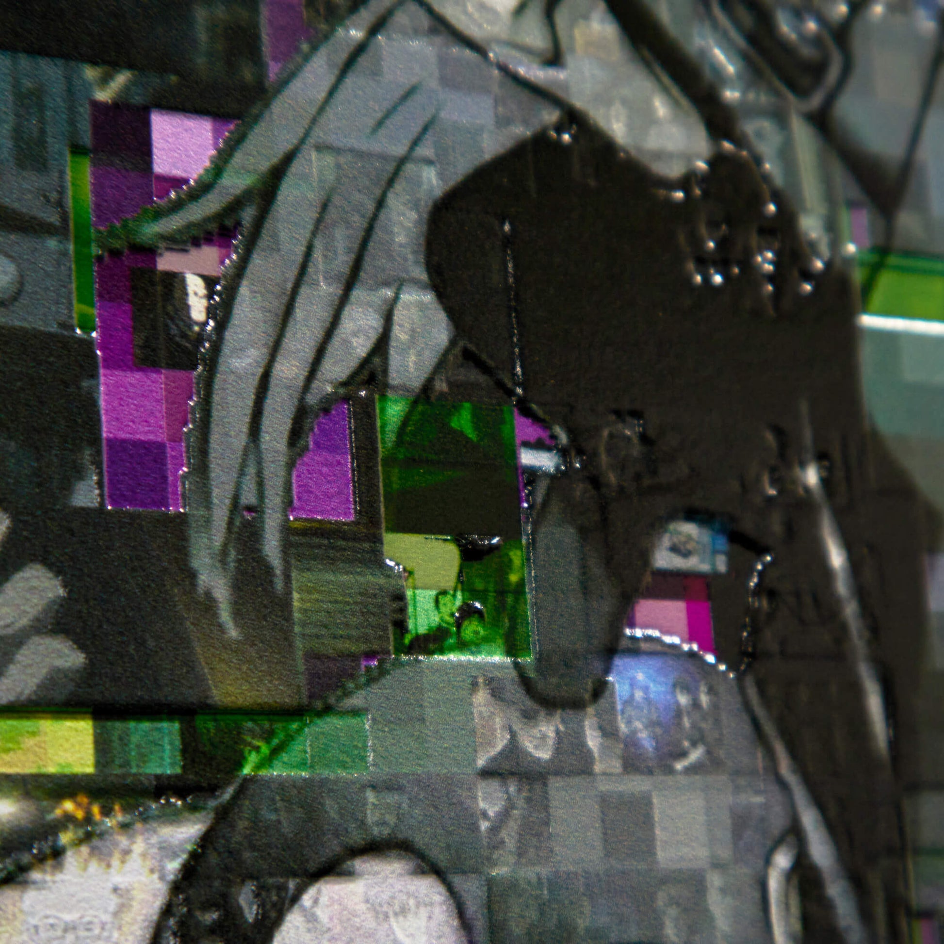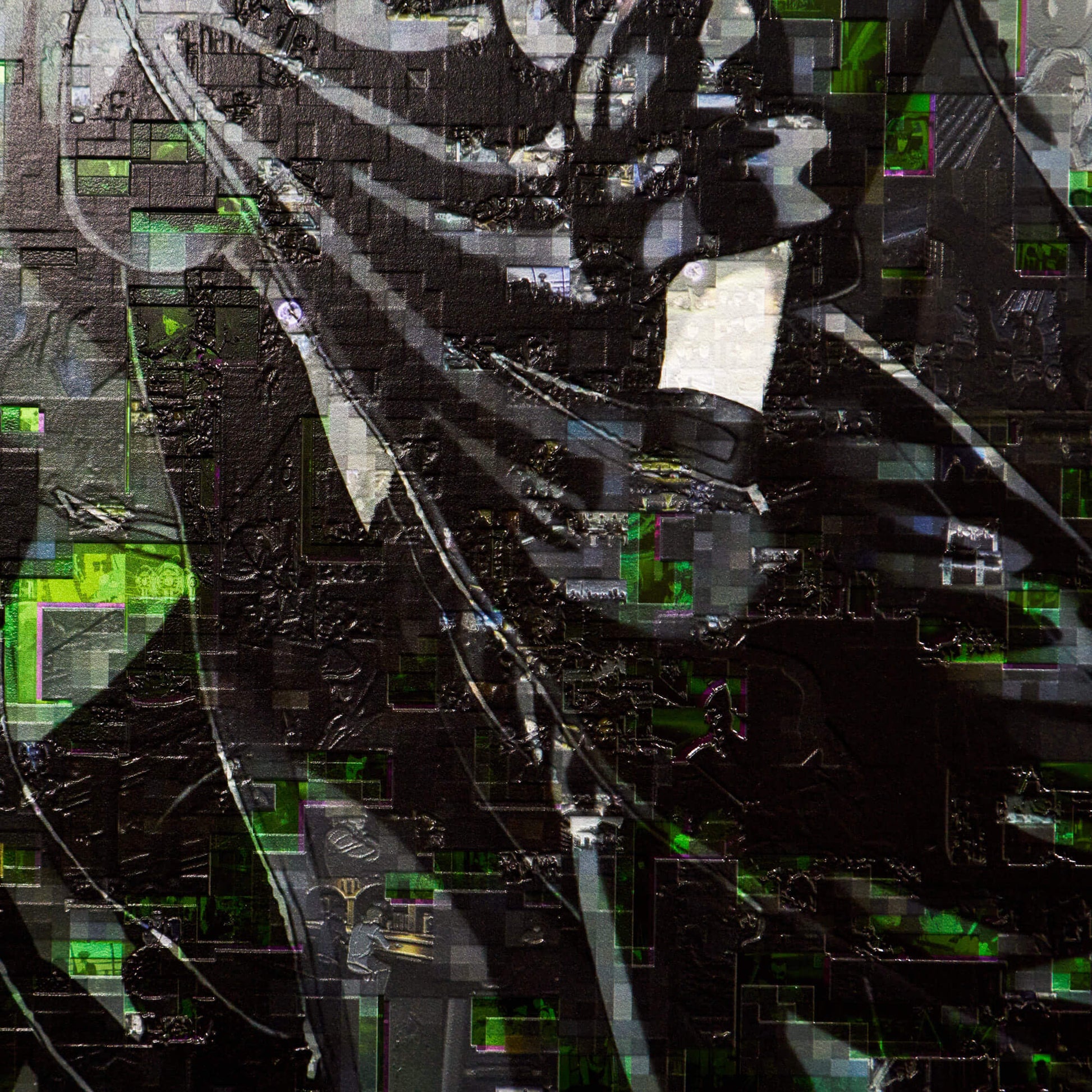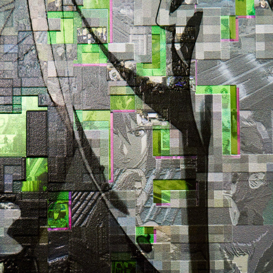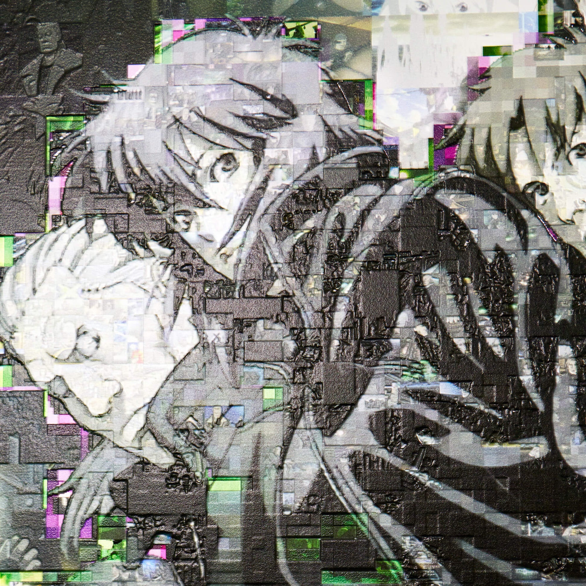The converge art piece “Recompile”, a signature technique of GAAAT, reconstructs the key visual of “Ghost in the Shell S.A.C. 2nd GIG” using countless scene stills from within the work. By fragmenting a single original and then “recompiling” it, the intentionally inserted noise expresses the uncertainty of memory and the ambiguous boundary between truth and fake.