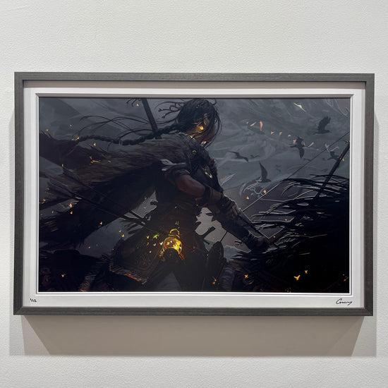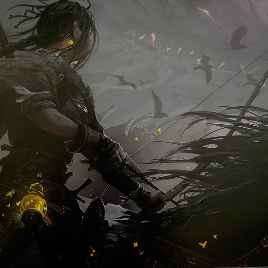 Horseback archery is both a graceful and powerful visual element that inspired me greatly for this piece. The combination of a strong sense of speed combined with the precision of archery creates a very interesting visual juxtaposition. However, cool poses and movements are much easier to appreciate as an artist than they are to draw! Beyond the overall shape of the subject, there are additional nuances such as how much weight the rider is putting on the saddle versus the stirrups, how tense the pose is, and so on. It was difficult to achieve the right balance with all these factors, and this is often the moment where you think to yourself - I really needed more practice on this! Beyond the technical execution of the pose, I also wanted to design a good set of visuals for the character. I wanted a character that felt believable and real, while at the same time feeling like someone out of fantasy. To do so, I borrowed many design elements from nomadic cultural dress, while allowing myself some leeway to experiment. Lastly, I wanted to give the character a more direct sense of purpose that the viewers can also see, which is why the flying beast was added!
