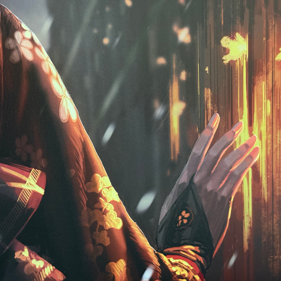 A dark clothed lady passes through a looming gate, as the snow falls heavily in the gloom. Introducing movement into a static illustration is an always evolving challenge, with the format itself often working against our goals. Rather than drawing the physical footsteps or the character in mid step explicitly, it is also possible to use context to great effect. In this illustration, I wanted not only to show the character entering the gate of the castle, but also to highlight the details of her clothing and the movement of her hair in the wind. Using this composition, we are able to indicate several of these key factors effectively. The sweeping motion of her hand on the open gate, combined with the upright, forward looking pose tells the story on its own, with some help with the warm flowers blossoming in the snow.