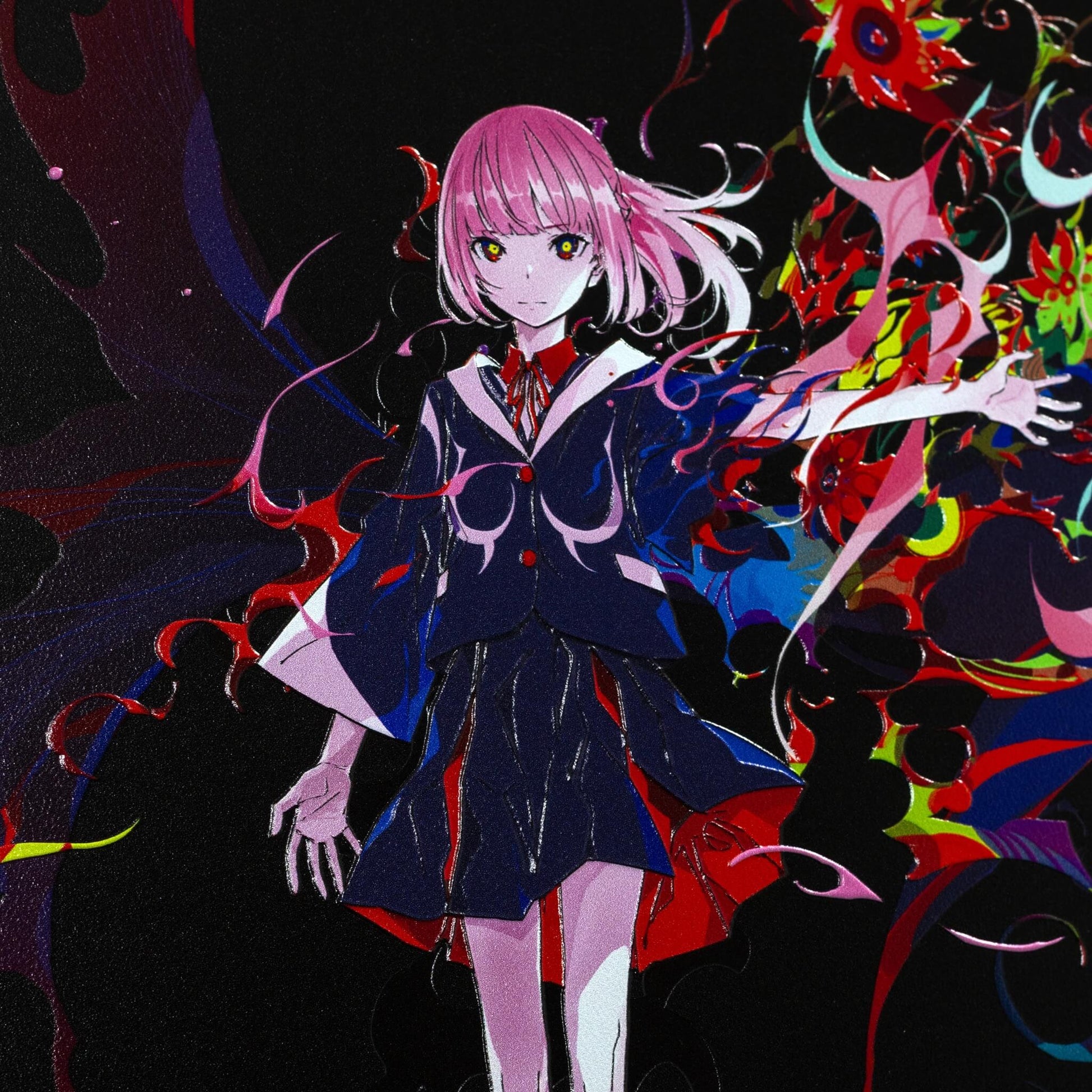 2次元のデジタルアートを、アートピースとして仕上げました。 光の当たり方で見え方が変わり、線や色がより立体的に感じられる表情を楽しめます。