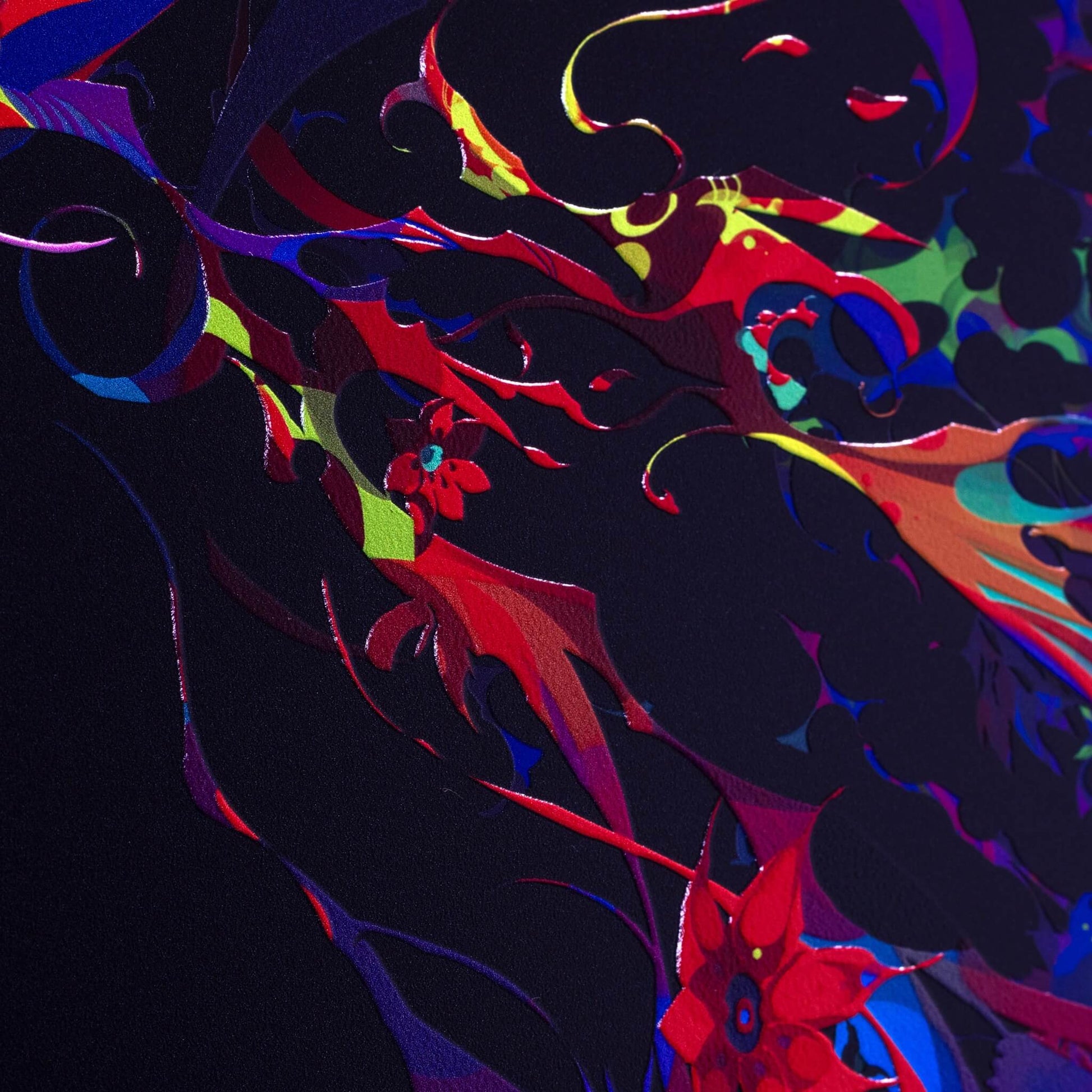 デジタルデータを32層に分割する特殊なデータ設計技術を駆使し、凹凸や色味の繊細な表現を実現しました。これにより、従来のアート作品にはない、深みのある質感と立体感を感じていただけます。